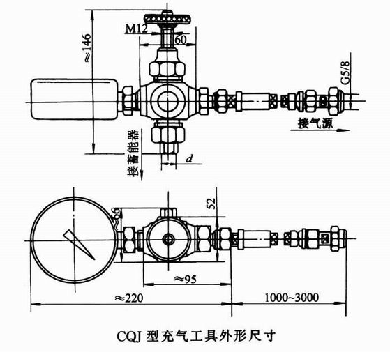 型 號(hào) | 公稱壓力 /MPa | 配用壓力表 | 與蓄能器連接尺寸 /mm | 膠管內(nèi)徑規(guī)格 /mm |